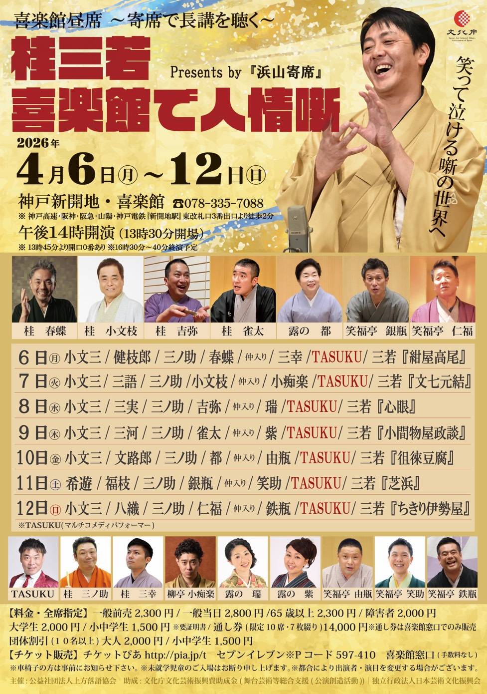 2026年4月6日(月)より、桂三若師匠による「喜楽館で人情噺」が開催されます。なんと7日間、日替わりで人情噺の名作を披露するという、まさに三若師匠の真骨頂ともいえる挑戦的な公演です。
