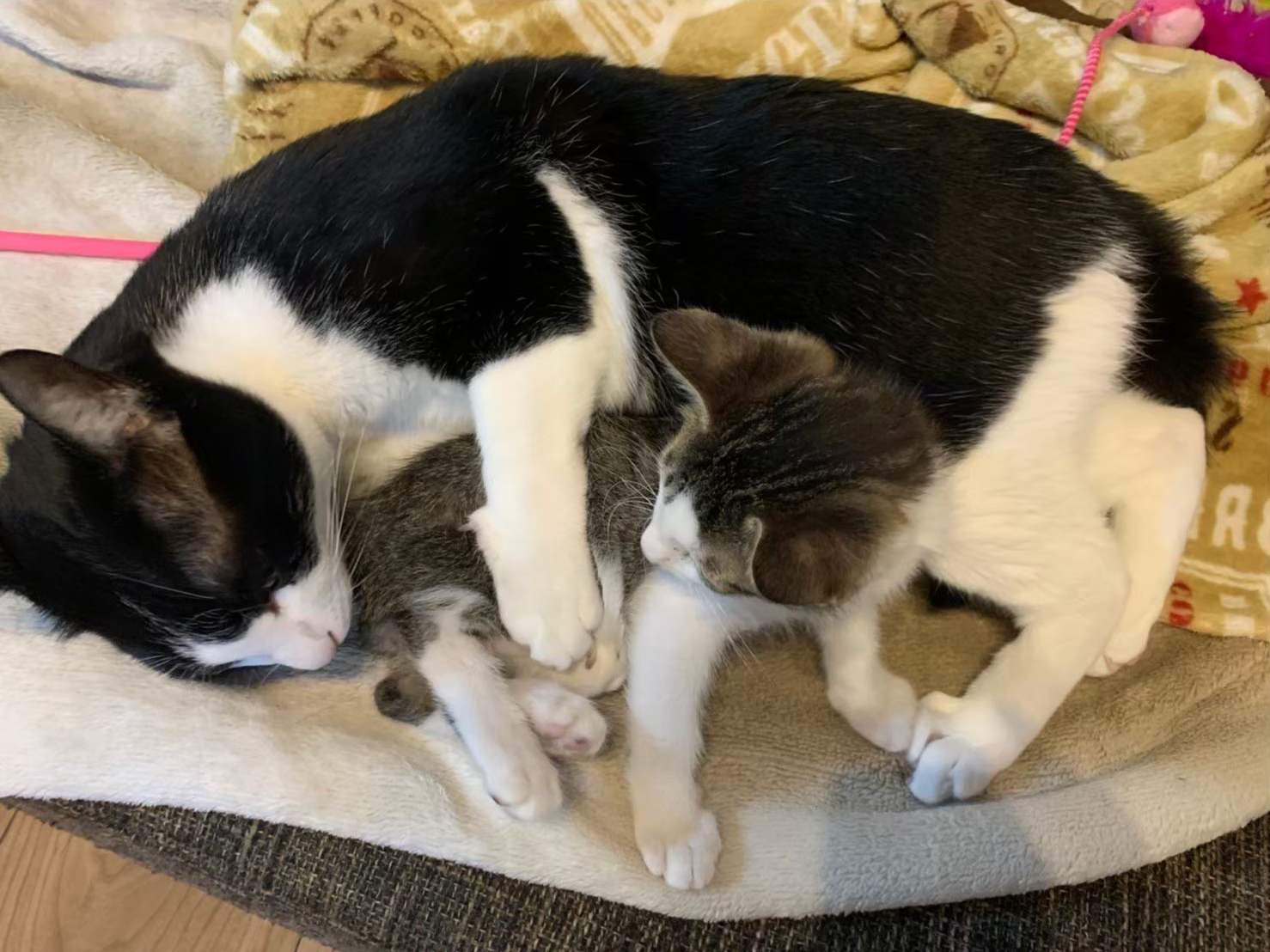 実はきゅんくんは寝たきり。人間がお世話をしなくてはならない体です。それでもその存在は家族の中心にありました。同居する他の猫たちも、それを知っているかのように静かに寄り添います。